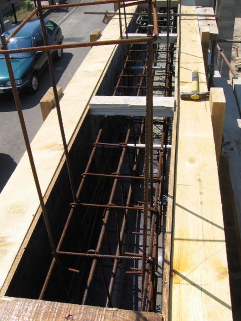 - Samedi matin, décoffrage des flancs et installation d'un mat pour simuler le sommet du pignon puis mise en place des deux piliers en fer à béton.